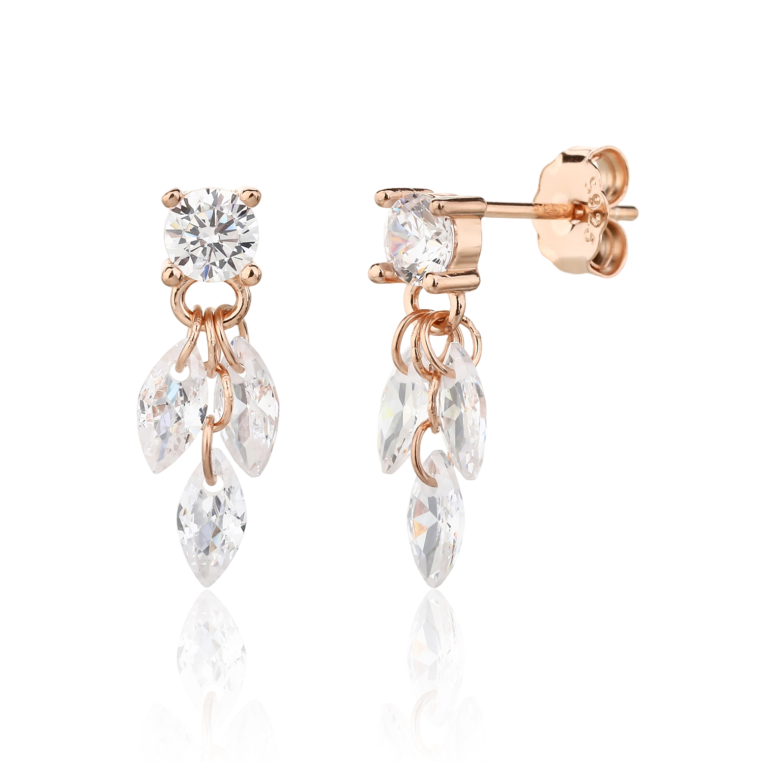 עשויים כסף אמיתי 925 ומצופים זהב אדום (רוז גולד) משובצים אבני זרקון. העגילים מגיעים כזוג.